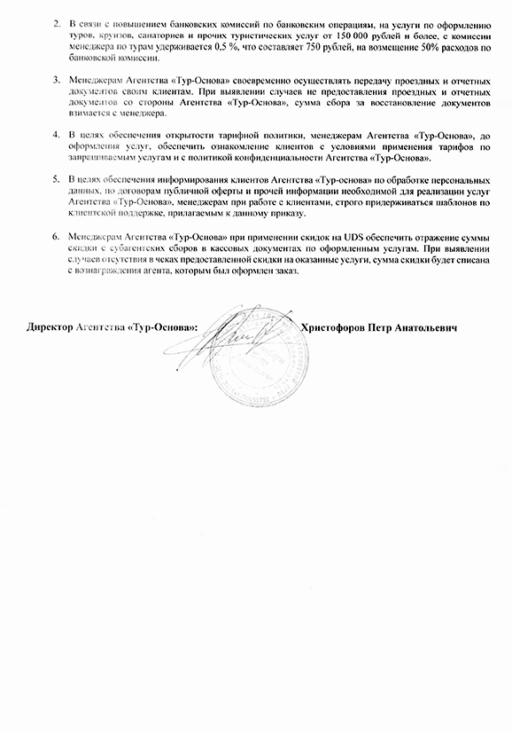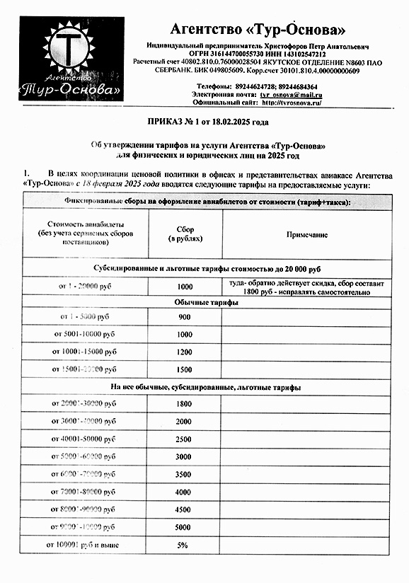 Приказ 1 от 18.02.2025г Тарифы на услуги Агентства Тур Основа на 2025