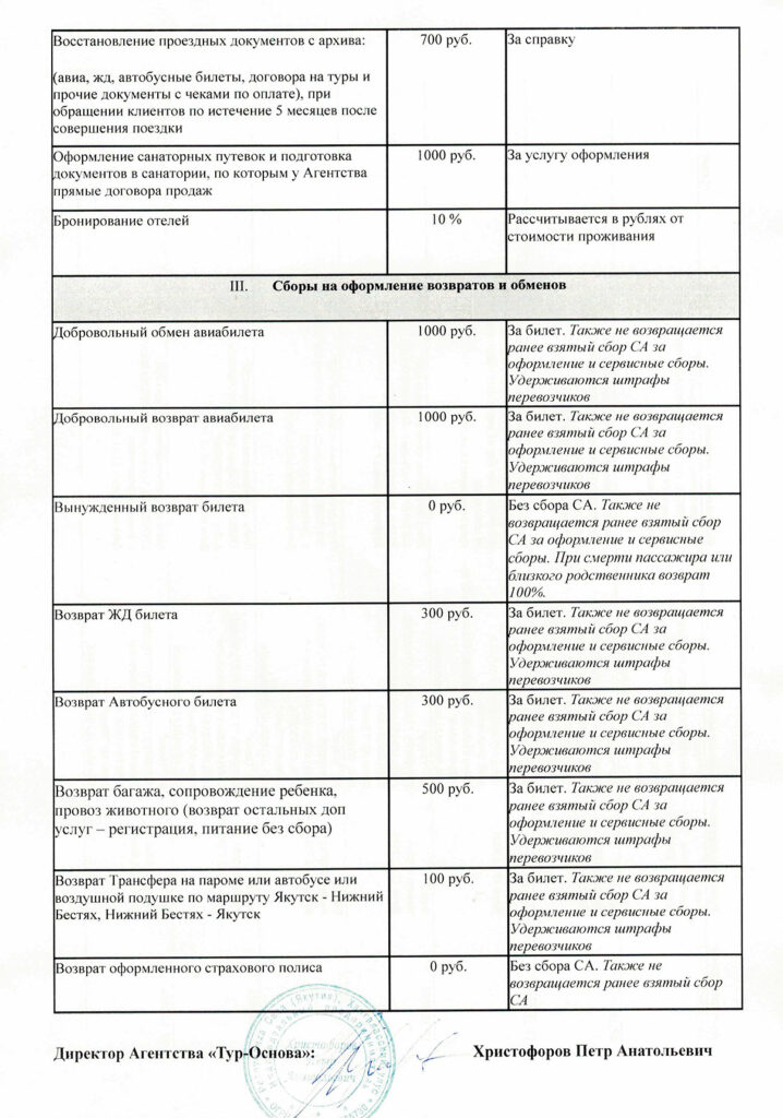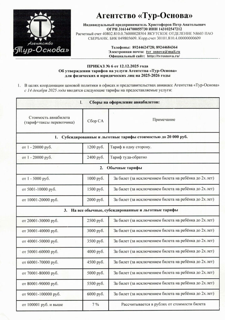 Об утверждении тарифов, на услуги, предоставляемые Агентством » Тур-Основа» для физических и юридических лиц на 2025 -2026годы.